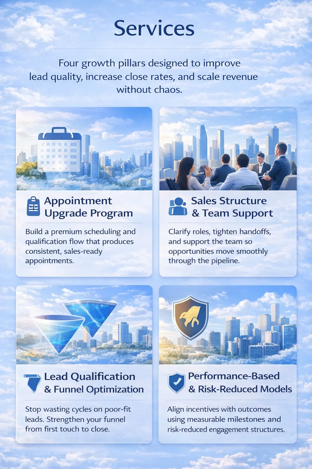 Our programs are risk-reduced and performance-aligned. If qualified appointments aren’t delivered, you don’t pay—or in certain structures, you only pay a percentage of closed sales. Our success is directly tied to yours.